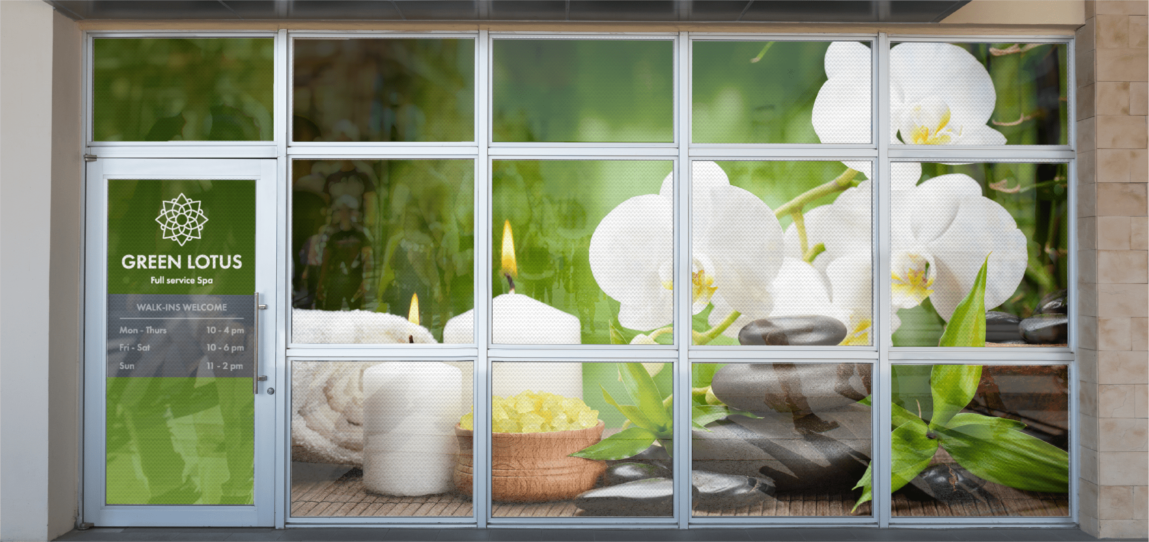 These decals are for indoor and outdoor use. When installed, these decals are adhered to the outside of the window like the photo below. The most common uses include business/storefront advertising, window decor, product promotion, window signage, and branding. Mainly used to cover entire windows, they also deflect sunlight and provide shade and privacy.